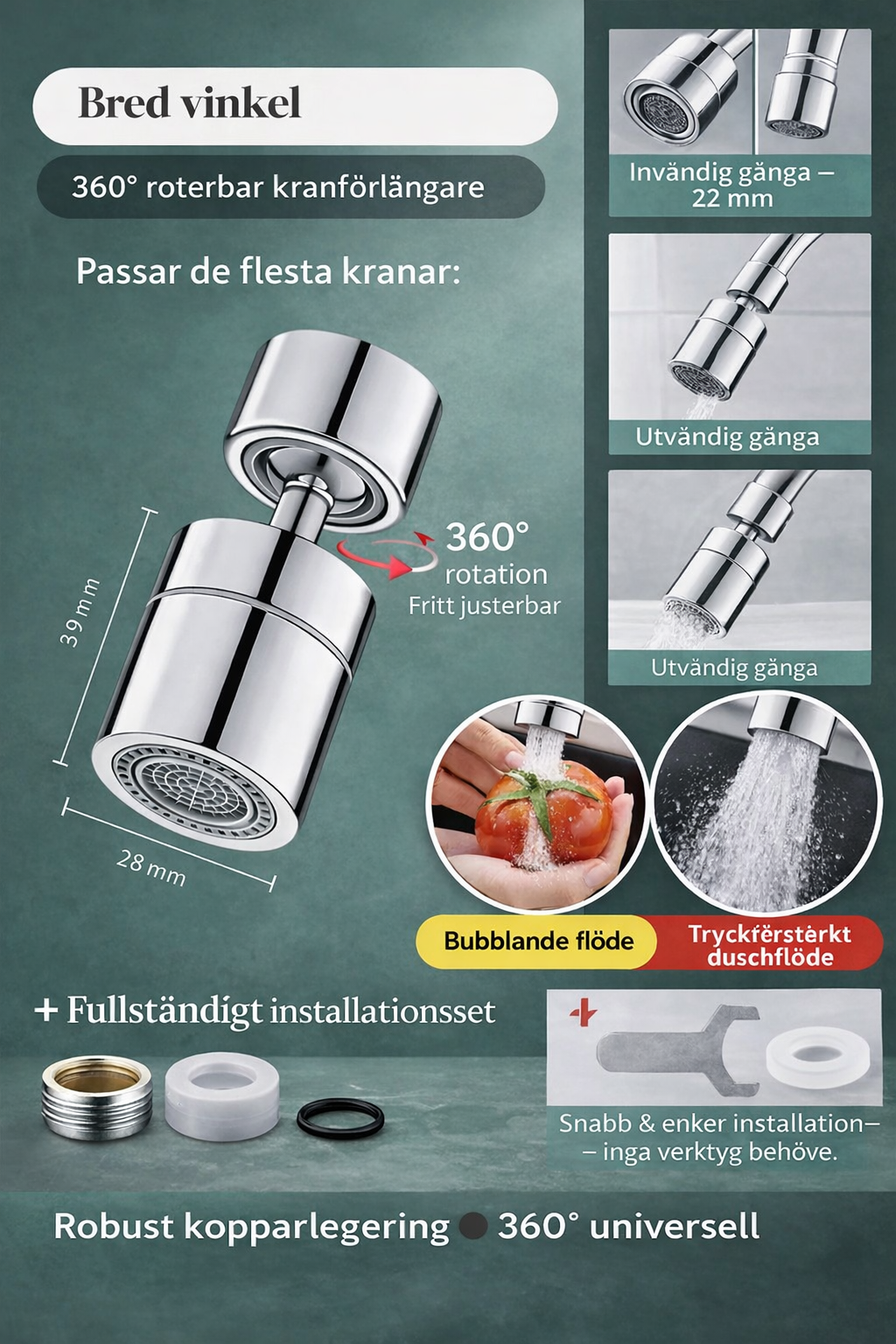 HydroFlex 360 är tillverkad i högkvalitativ kopparlegering med slitstark kromfinish.